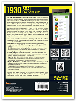 Buku TOP SUKSES TPA SBMPTN & Seleksi Mandiri PTN+PTS dibuat khusus untuk mengenalkan Anda pada berbagai macam model tes TPA yang sering diujikan pada ujian masuk PTN (SBMPTN). Secara umum, dalam buku ini terdiri dari 5 bagian, yaitu teori ringkas, soal dan pembahasan, Latihan soal tiap dimensi kemapuan, Tipe Soal SBMPTN, Try Out Mandiri, Prediksi SBMPTN. Buku ini didesain dengan apik dan menarik serta dilengkapi dengan pembahasan soal serta latihan soal yang sangat memadai, maka buku ini sangat layak untuk dibaca oleh Anda sebagai bahan belajar yang tepat. Semoga buku ini dapat memberikan manfaat maksimal kepada masyarakat luas, terutama untuk mereka yang akan meneruskan ke pendidikan ke jenjang yang lebih tinggi.