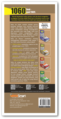 Buku ini sangat berbeda dari buku yang sudah beredar luas di pasaran. Berisi soal-soal TOEFL terbaru dilengkapi dengan 4 paket simulasi android, yang dapat di-download di playstore secara gratis. Buku dan software ini memuat lebih 1060 soal yang dapat digunakan sebagai acuan belajar peserta tes dan sebagai latihan sehingga menjadi senjata ampuh dalam menembus skor yang diinginkan. Jumlah soal yang fantastis, yang tidak pernah ada di buku lain yang khusus membahas grammar TOEFL.