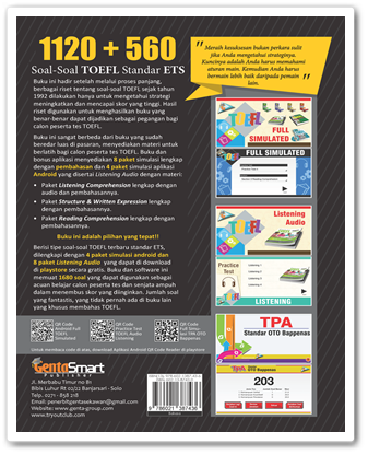 Buku ini berisi tipe soal-soal TOEFL terbaru standar ETS, dilengkapi dengan 4 paket simulasi android dan 8 paket Listening Audio, yang dapat di download di playstore secara gratis. Buku dan software ini memuat 1680 soal yang dapat digunakan sebagai acuan belajar calon peserta tes dan senjata ampuh dalam menembus skor yang diinginkan.