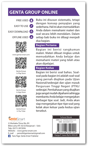 Bagian Kedua berisi soal-soal yang pernah diujikan pada Ujian Nasional dan Ujian masuk Perguruan Tinggi Negeri disertai pembahasaan lengkap.