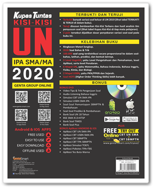 Buku Kupas Tuntas Kisi Kisi UN SMA/MA IPA 2020 hadir setelah melalui proses panjang. Berbagai langkah dilakukan agar menghasilkan buku yang benar-benar dapat dijadikan sebagai pegangan bagi calon peserta Ujian Nasional dan USBN Tingkat SMA/MA. Buku ini sangat berbeda dari buku yang sudah beredar luas di pasaran. Dalam buku ini dibahas secara detail untuk tiap pelajaran (Matematika, Bahasa Indonesia, Bahasa Inggris, Fisika, Kimia, dan Biologi) yang meliputi Pendalaman Materi tiap SKL, Contoh Soal dan Pembahasan, Latihan Soal dan Pembahasan, serta Prediksi dan Pembahasan.