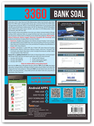 Berisi kisi-kisi UN terbaru dilengkapi dengan software CBT simulasi UN, yang dapat digunakan sebagai latihan sehingga menjadi senjata ampuh dalam mencapai nilai tinggi pada tiap mata pelajaran. Sebanyak 3360 soal ada dalam buku dan CD-nya. Jumlah soal yang fantastis , yang tidak pernah ada dalam buku lain yang khusus membahas Ujian Nasional.